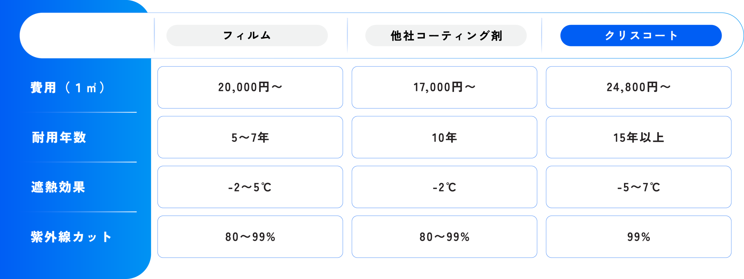フィルムや有機溶剤を用いたコーティングは経年劣化で白濁、剥がれが発生します。